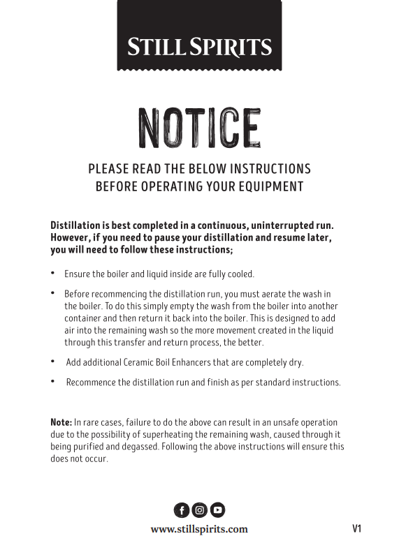 Before restarting your distillation run, ensure that your boiler has cooled down, then aerate your wash.